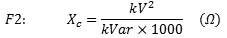 The following calculation can be used to calculate the capacitive reactance of a single phase capacitor commonly used on medium and high voltage capacitor banks. Use formula F1 when frequency and the capacitance of the capacitor are known. Use Formula F2 when the capacitor voltage and kvar are known.