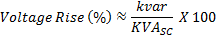 The voltage rise resulting from the application of a shunt capacitor bank is related to the system strength (i.e. KVAsc) and kvar of the bank. The voltage rise is directly proportional to the bank kvar rating and inversely proportional to the system short circuit level.