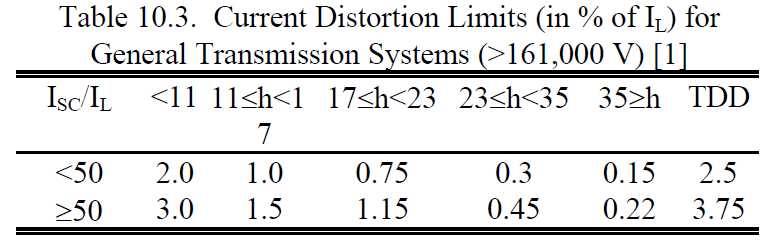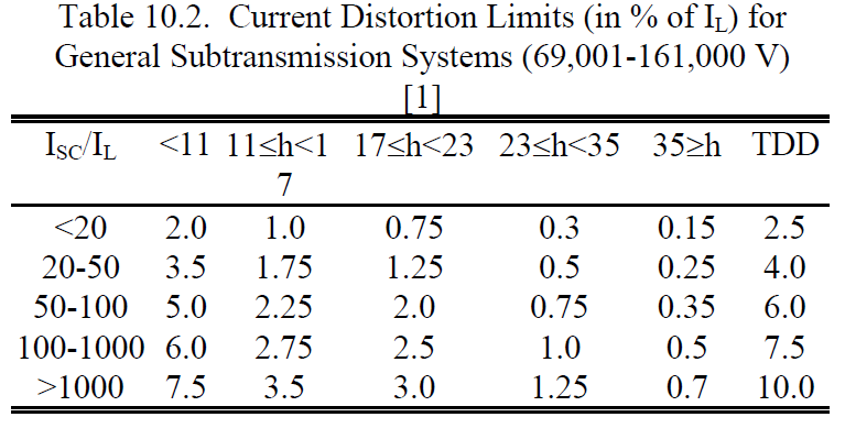 IEEE 519, "Recommended Practices and Requirements for Harmonic Control in Electrical Power Systems" provides suggested limits for harmonic current distortion as shown in Tables 10.1, 10.2, and 10.3 below. The tables are dependent on several variables and concepts defined as follows: